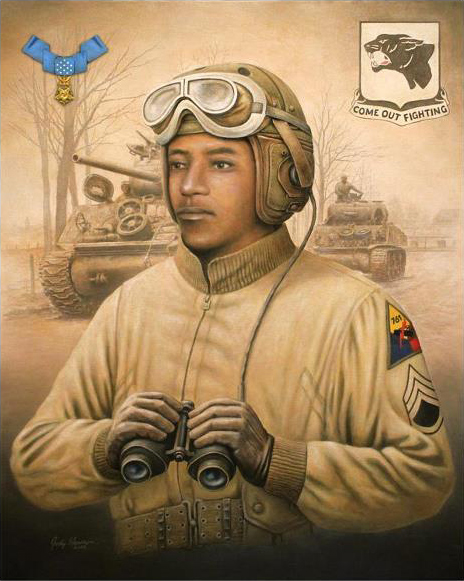 | The target for Nov. 16 was Guebling, France. Rivers' tank hit a mine at a railroad crossing while advancing toward the town with his company. His leg was slashed to the bone in the explosion, but he refused a morphine injection and, as many would do in the 761st, he also refused to be evacuated. He would refuse numerous evacuation offers over the next few days. Taking command of another tank, Rivers advanced with his company to take Guebling the next day and directed his tank's fire at enemy positions east of town through the morning of Nov. 19, despite the company losing three of its five tanks in the town to antitank fire and one to mines. One tank crew acquired a replacement and returned to the town. |