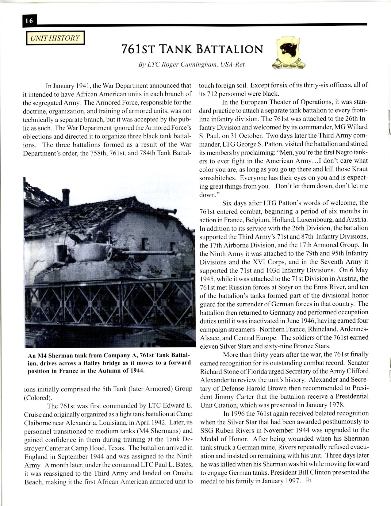Six days after LTG Patton's words of welcome, the 761 st entered combat, beginning a period of six months in action in France, Belgium, Holland, Luxembourg, and Austria. In addition to its service with the 26th Division, the battalion supported the Third Army's 71st and 87th Infantry Divisions, the 17th Airborne Division, and the 17th Armored Group. In the Ninth Anny it was attached to the 79th and 95th Infantry Divisions and the XVI Corps, and in the Seventh Army it supported the 71st and 103d Infantry Divisions. On 6 May 1945, while it was attached to the 71 st Division in Austria, the 76lst met Russian forces at Steyr on the Enns River, and ten of the battalion's tanks formed part of the divisional honor guard for the surrender of German forces in that country. The battalion then returned to Germany and performed occupation duties until it was inactivated in June 1946, having earned four campaign streamers - Northern France, Rhineland, Ardennes-Alsace, and Central Europe. The soldiers of the 761 st earned eleven Silver Stars and sixty-nine Bronze Stars.